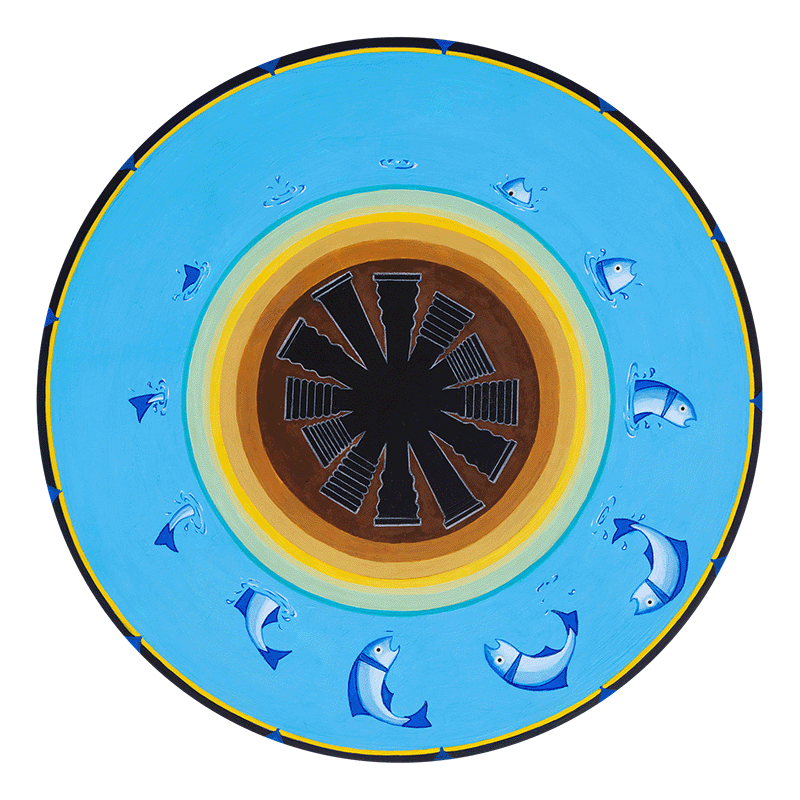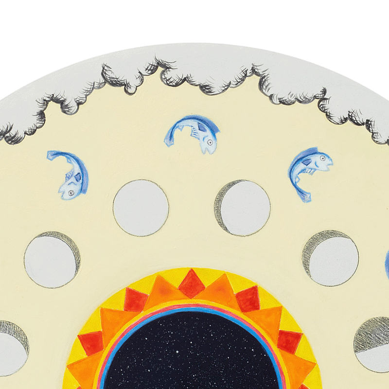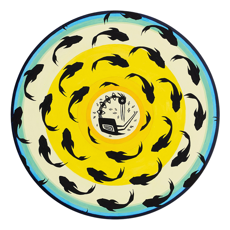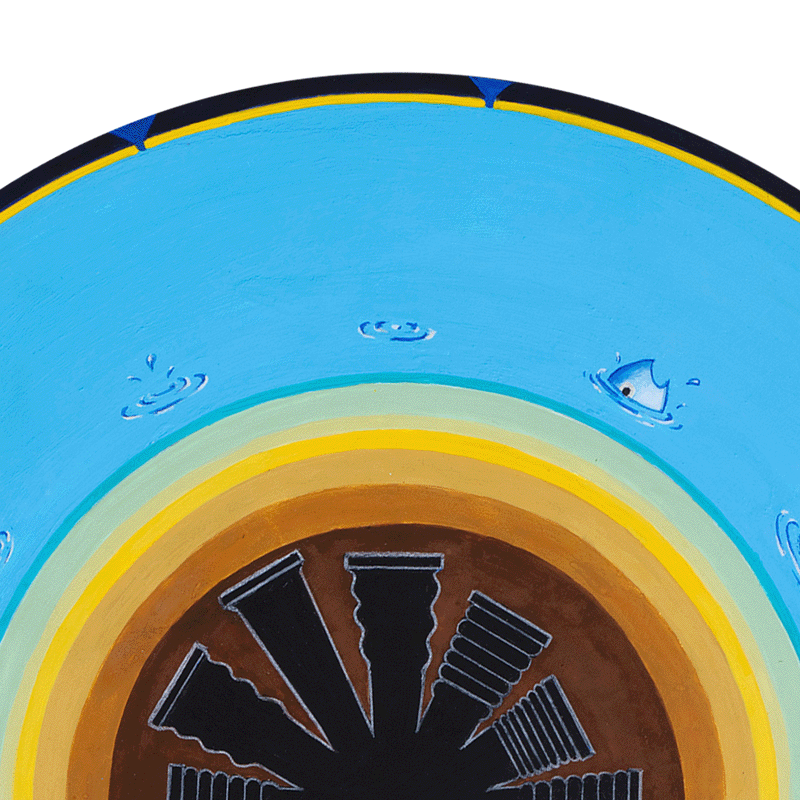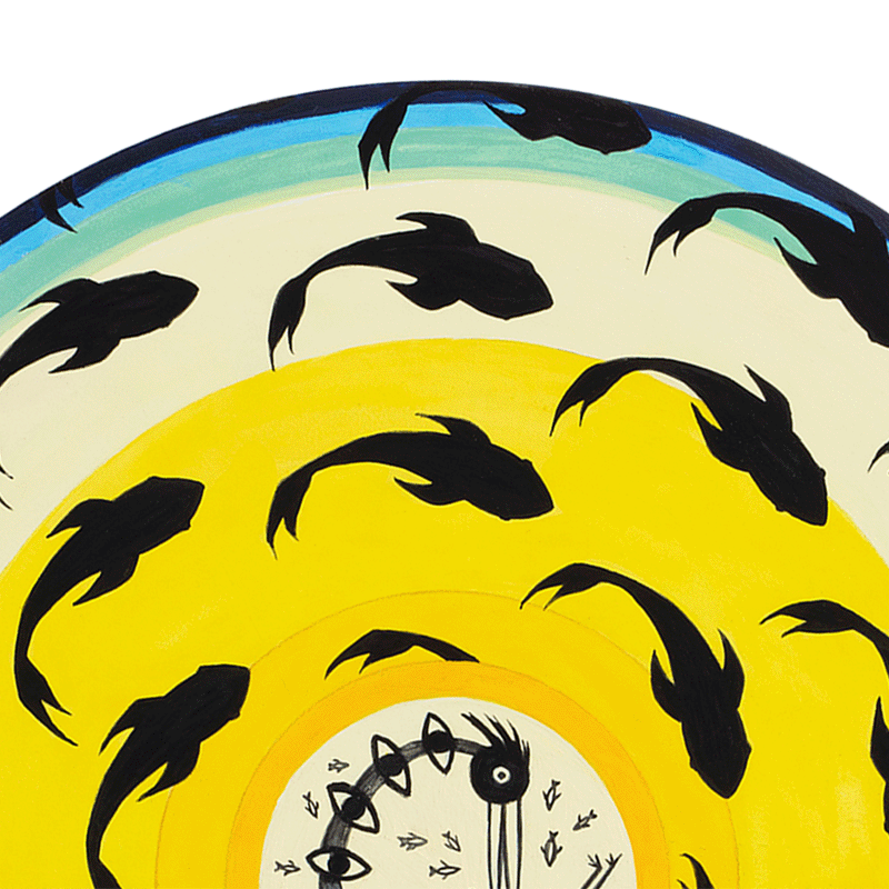 Artistic commission for the XIV FEMSA Biennial Inestimable azar, which consisted of the production of a series of 12 paintings in gouache on broken slices of huanacaxtle (or parota) wood, whose surface, slightly concave as trays - or bateas: popular ornamental plates-, contained contemporary stories of conflict from the Michoacán region in concentric circles as omens with Purépecha sentences. Accompanied by a QR code, a rotating disc in motion with an animation hidden among the paintings is revealed.