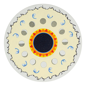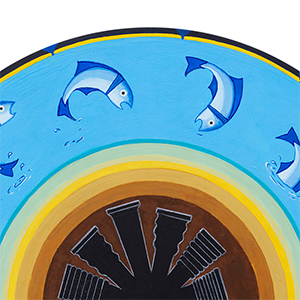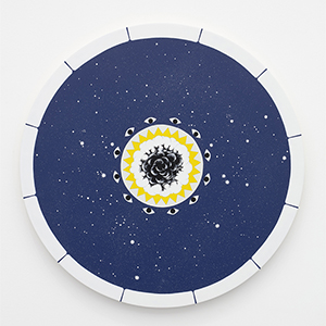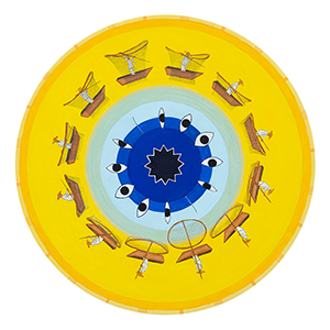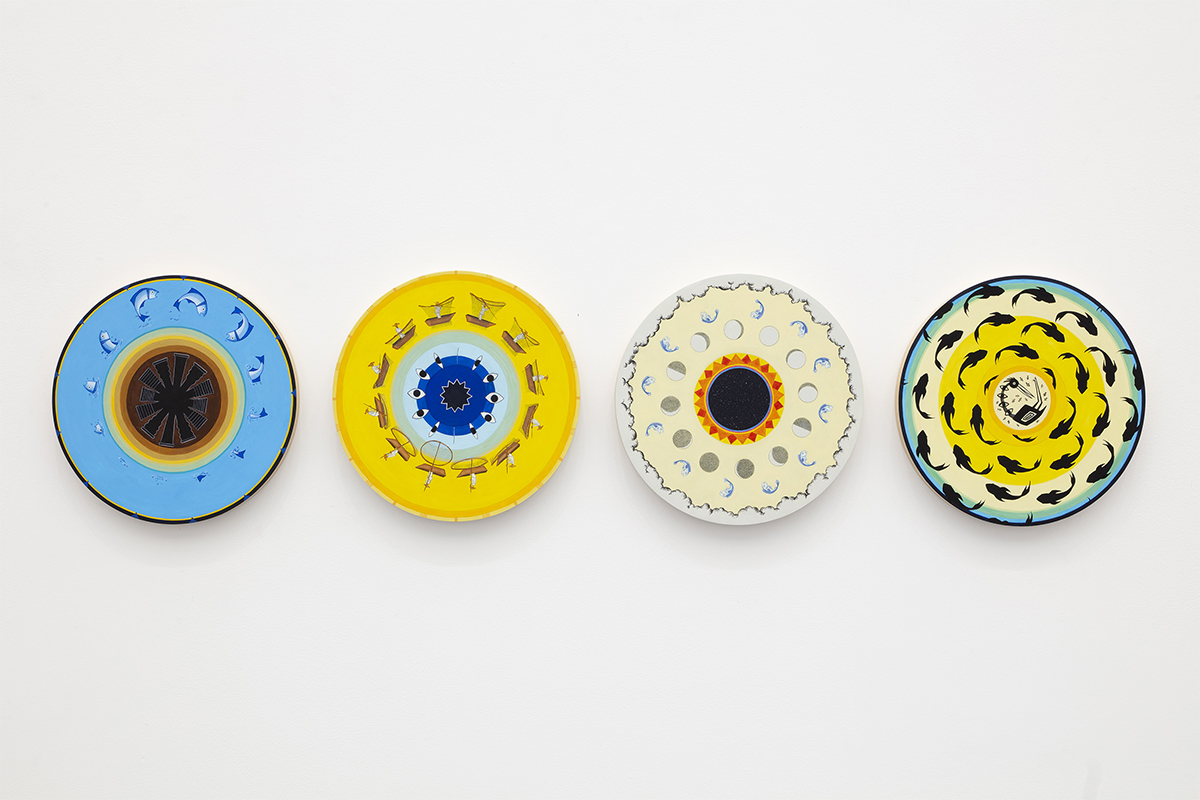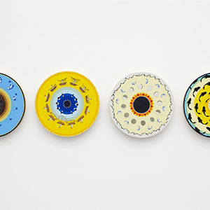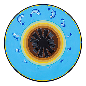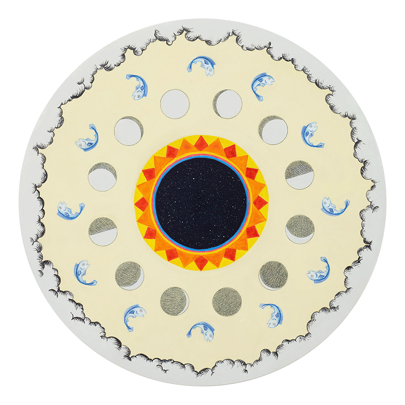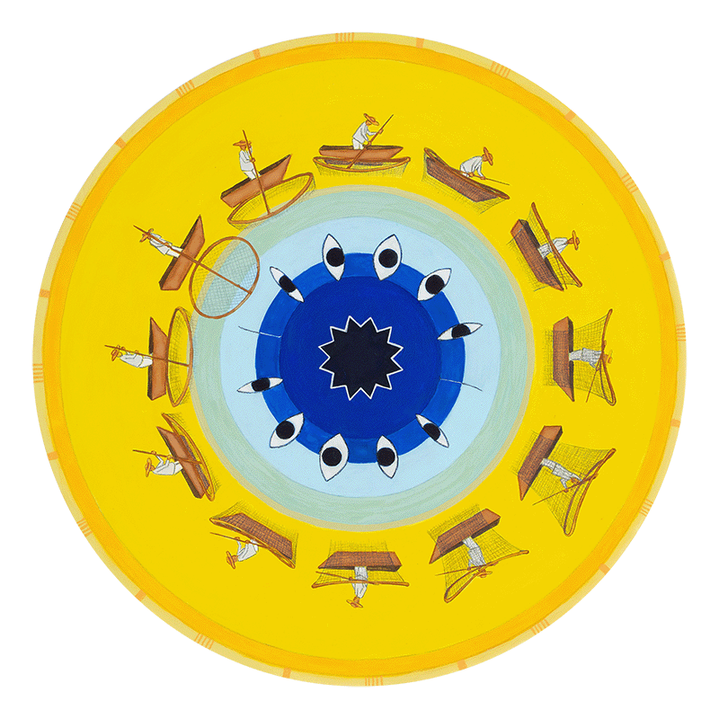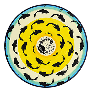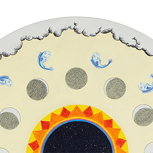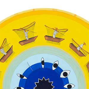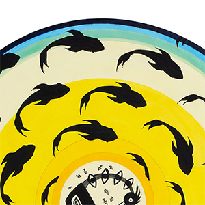 Artistic commission for the XIV FEMSA Biennial Inestimable azar, which consisted of the production of a series of 12 paintings in gouache on broken slices of huanacaxtle (or parota) wood, whose surface, slightly concave as trays - or bateas: popular ornamental plates-, contained contemporary stories of conflict from the Michoacán region in concentric circles as omens with Purépecha sentences. Accompanied by a QR code, a rotating disc in motion with an animation hidden among the paintings is revealed.