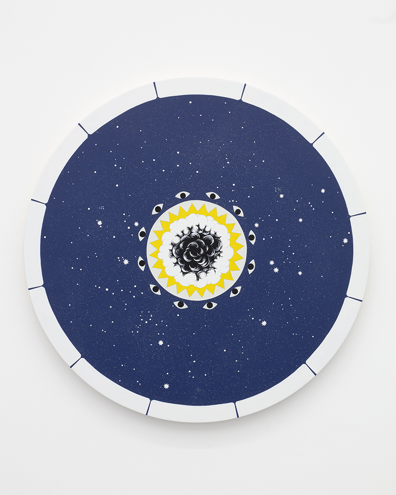 Comisión artística para la XIV Bienal FEMSA Inestimable azar. La serie Agüeros consistió en la producción de una serie de 12 pinturas en gouache sobre rodajas quebradas de madera de huanacaxtle (o parota), cuya superficie, ligeramente cóncava a modo de bateas -o peribanas: platos ornamentales populares-, contenía relatos contemporáneos de la zona de Michoacán, México en círculos concéntricos encriptados a modo de presagios con sentencias purépechas. Acompañadas de un código QR, las pinturas se imponen como un disco giratorio cuya animación revela ciclos de devastación que inundan la región.