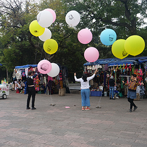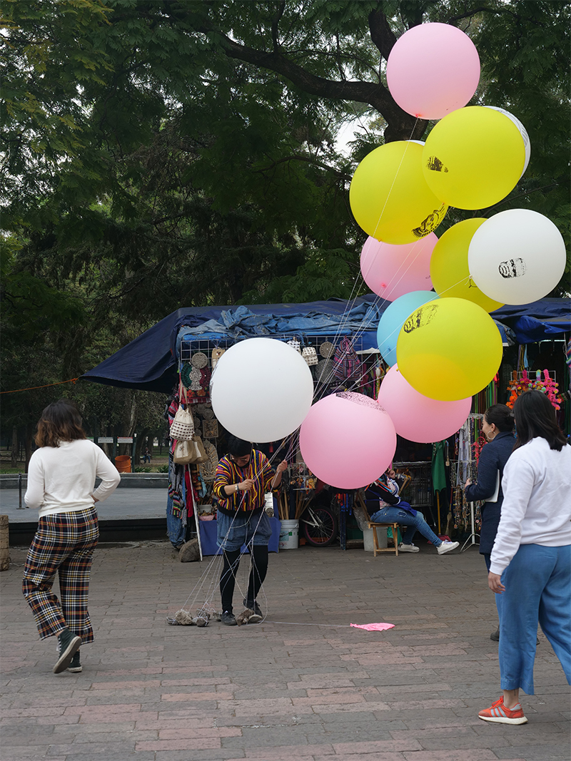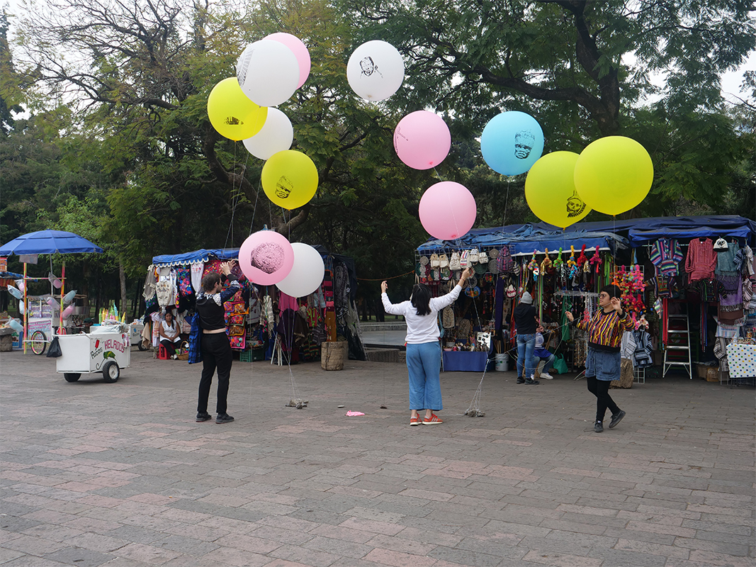 Nueva colección prehispánica de danza aérea (New pre-Hispanic Aerial Dance Collection) seeks to put in crisis, through a playful act, the concepts of conservation and cultural heritage that give rise to national identity, an identity that is built on the archaeological ruin that has been the result of looting and violence of the colonial historical process. This project takes the collection out of the museum and returns it to an everyday context through the creation of new popular, portable and economical objects, subverting the solemnity of the pieces in the museum through material of a festive nature (influenced by the local trade of the area that is supported by plastic) and that is distributed free of charge among passers-by outside the museum. At the same time, the multiple reproductions recall the idea of the souvenir, trying to smooth out the dichotomous notion of originals/fakes, as well as eliminate the implicit distance that these objects keep within the museum and the viewer.